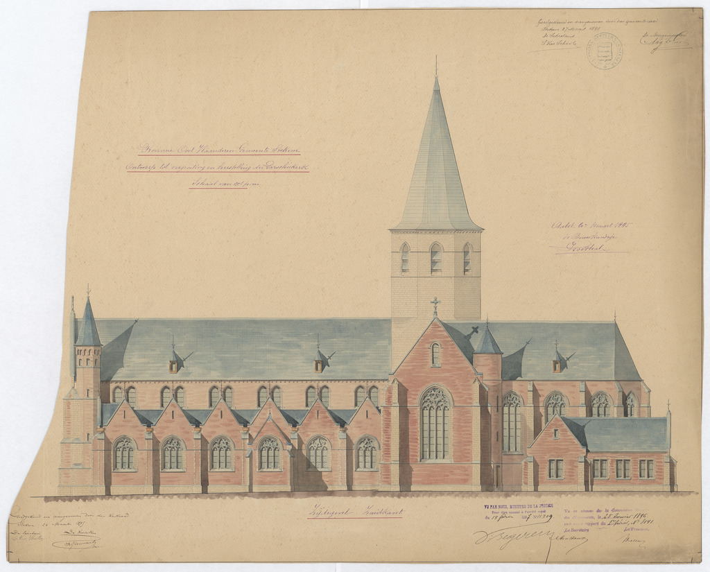 Opschrift: Provincie Oost-Vlaanderen. Gemeente Stekene. Ontwerp tot vergrooting en herstelling der Parochiekerk. Omschrijving plan: opstand Z-gevel Datum KCML: 25/01/1896 Archiefnummer: O1195