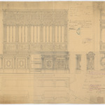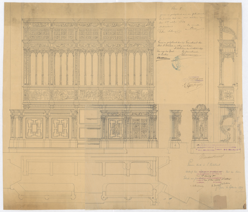 Opschrift: Primaire kerk te S. Nikolaas. Ontwerp van zittingen in eikenhout voor den koor. Omschrijving plan: voor- en zijaanzicht koorgestoelte (aangepast ontwerp) Datum KCML: 13/01/1900 Archiefnummer: O1172_01
