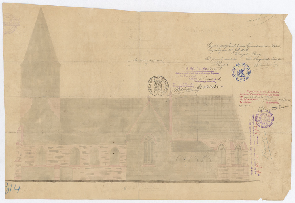 Opschrift: Provincie Oost-Vlaanderen. Gemeente Belcele. Parochiale Kerk. Ontwerp van herstelling der gevels. Omschrijving plan: opstand Z-gevel Datum KCML: 13/10/1906 Archiefnummer: O1178