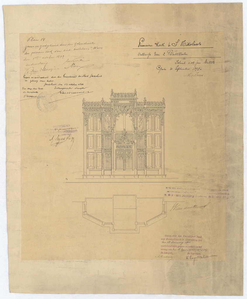 Opschrift: Primaire kerk te S. Nikolaas. Ontwerp van 2 biechtstoelen. Omschrijving plan: plattegrond en vooraanzicht biechtstoel. Datum KCML: 13/01/1900 Archiefnummer: O1168