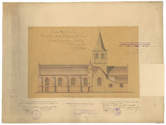 Opschrift: Provincie Oost-Vlaanderen. Parochiale Kerk van St. Martens Laethem. Ontwerp tot vergrooting en herstelling. Omschrijving plan: opstand Z-gevel Datum KCML: 26/06/1897 Archiefnummer: O1116_02