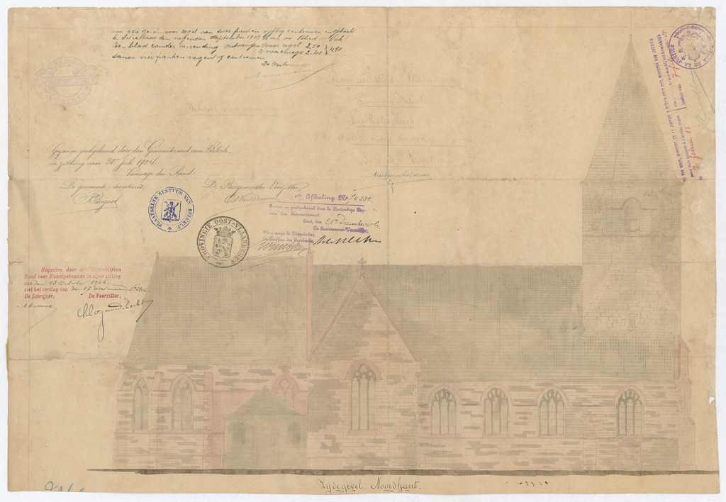 Opschrift: Provincie Oost-Vlaanderen. Gemeente Belcele. Parochiale Kerk. Ontwerp van herstelling der gevels. Omschrijving plan: opstand N-gevel Datum KCML: 13/10/1906 Archiefnummer: O1177