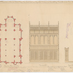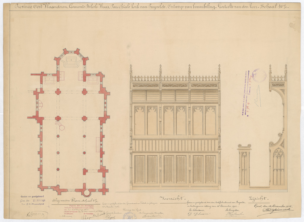 Opschrift: Provincie Oost-Vlaanderen. Gemeente Belcele-Waas. Parochiale kerk te Puyvelde. Ontwerp van bemeubeling. Gestoelte van den koor. Omschrijving plan: plattegrond kerk, voor- en zijaanzicht koorgestoelte Datum KCML: 2 /02/1907 Archiefnummer: O1189