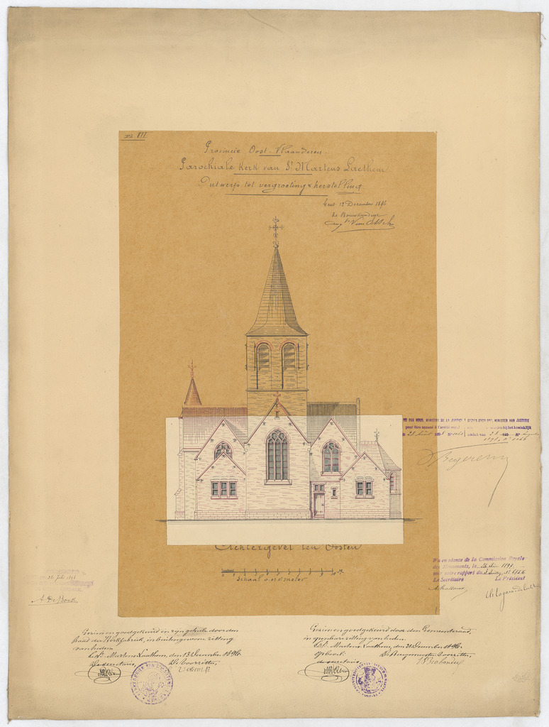 Opschrift: Provincie Oost-Vlaanderen. Parochiale Kerk van St. Martens Laethem. Ontwerp tot vergrooting en herstelling. Omschrijving plan: opstand achtergevel (aangepast ontwerp) Datum KCML: 26/06/1897 Archiefnummer: O1114_01