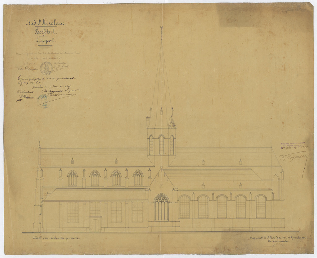 Opschrift: Stad St. Nikolaas. Hoofdkerk. Omschrijving plan: opstand zijgevel 1 Datum KCML: deze informatie wordt niet vermeld op het archiefstuk Archiefnummer: O1154