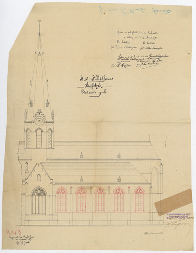 Opschrift: Stad St. Nikolaas. Hoofdkerk. Omschrijving plan: opstand zijgevel 1 Datum KCML: deze informatie wordt niet vermeld op het archiefstuk Archiefnummer: O1162
