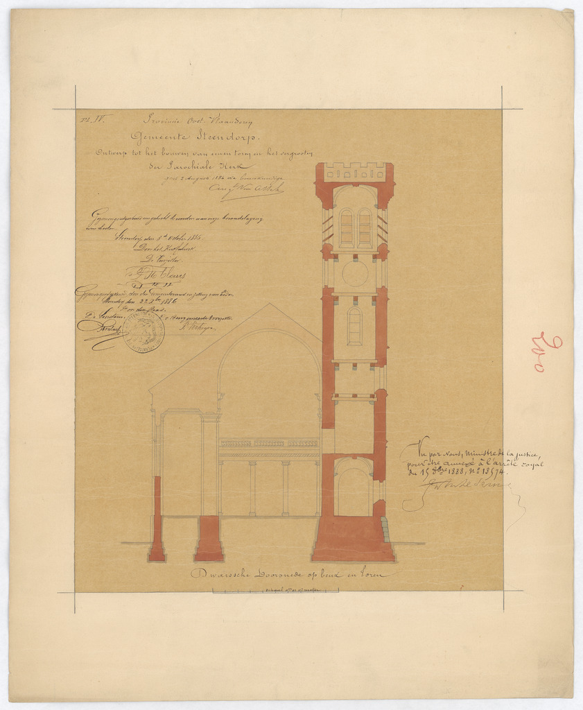 Opschrift: Provincie Oost-Vlaanderen. Gemeente Steendorp. Ontwerp tot het bouwen van eenen Toren en het vergrooten der Parochiale Kerk. Omschrijving plan: dwarsdoorsnede Datum KCML: deze informatie wordt niet vermeld op het archiefstuk Archiefnummer: O1238
