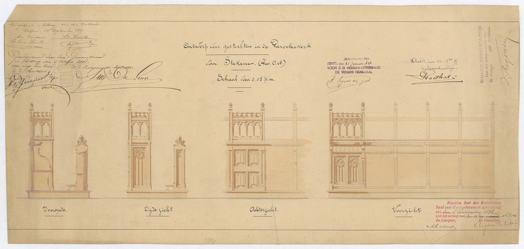 Opschrift: Ontwerp voor gestoelten in de Parochiekerk van Stekene (Prov. O. Vl.) Omschrijving plan: voor-, zij- en achteraanzicht gestoelte Datum KCML: 08/01/1898 Archiefnummer: O1205