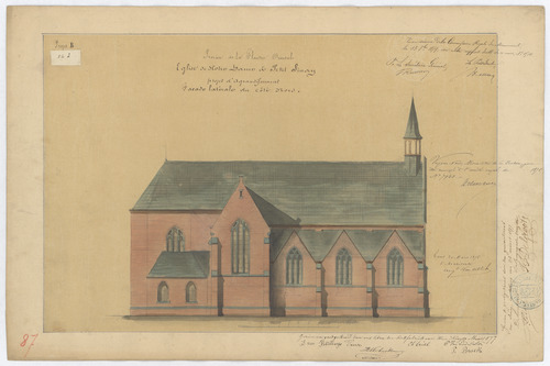 Opschrift: Province de la Flandre Orientale. Eglise de Notre Dame à Petit Sinay. Projet d'agrandissement Omschrijving plan: opstand zijgevel 1 Datum KCML: 13/10/1879 Archiefnummer: O1211