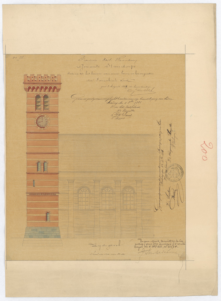 Opschrift: Provincie Oost-Vlaanderen. Gemeente Steendorp. Ontwerp tot het bouwen van eenen Toren en het vergrooten der Parochiale Kerk. Omschrijving plan: opstand zijgevel 1 Datum KCML: deze informatie wordt niet vermeld op het archiefstuk Archiefnummer: O1237