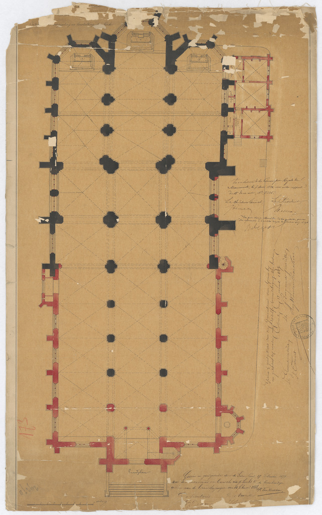 Opschrift: …. Ontwerp … vergrooting en herstelling der kerk. Omschrijving plan: plattegrond niveau 0 Datum KCML: 07/05/1886 Archiefnummer: O1216