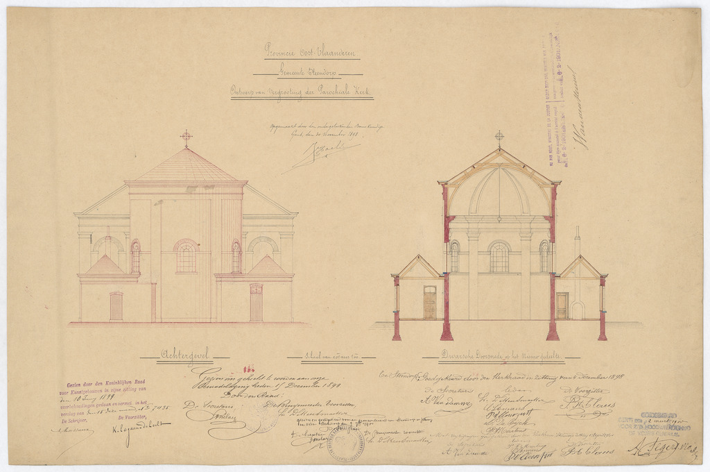 Opschrift: Provincie Oost-Vlaanderen. Gemeente Steendorp. Ontwerp van vergrooting der Parochiale Kerk. Omschrijving plan: opstand achtergevel en dwarsdoorsnede nieuwe toestand Datum KCML: 10/06/1899 Archiefnummer: O1241