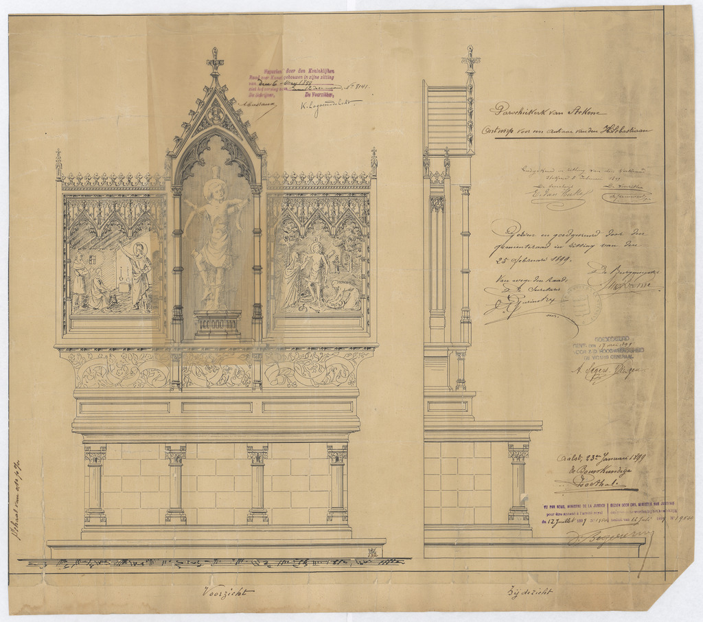 Opschrift: Parochiekerk van Stekene. Ontwerp voor een Autaar van den H. Sebastiaan Omschrijving plan: voor- en zijaanzicht altaar H. Sebastiaan (aangepast ontwerp) Datum KCML: 06/05/1899 Archiefnummer: O1203_01