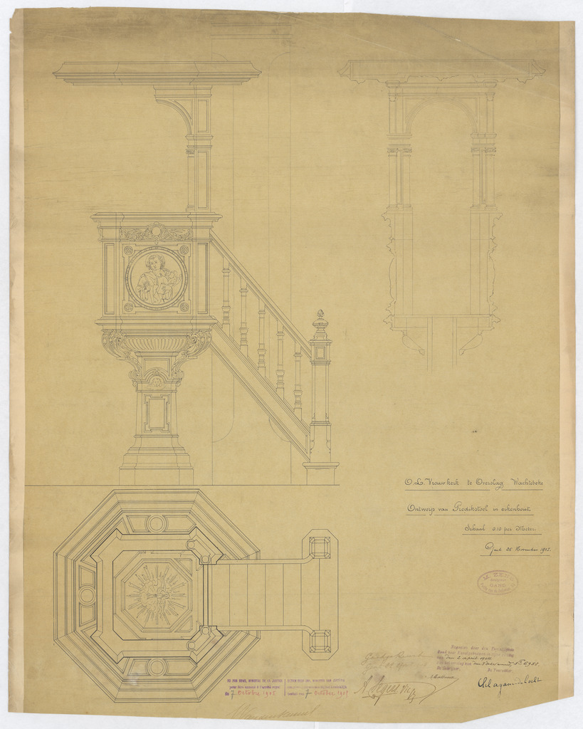 Opschrift: O.L.Vrouw kerk te Overslag Wachtebeke. Ontwerp van Predikstoel in eikenhout. Omschrijving plan: plattegrond een vooraanzicht preekstoel Datum KCML: 2 /04/1904 Archiefnummer: O1297