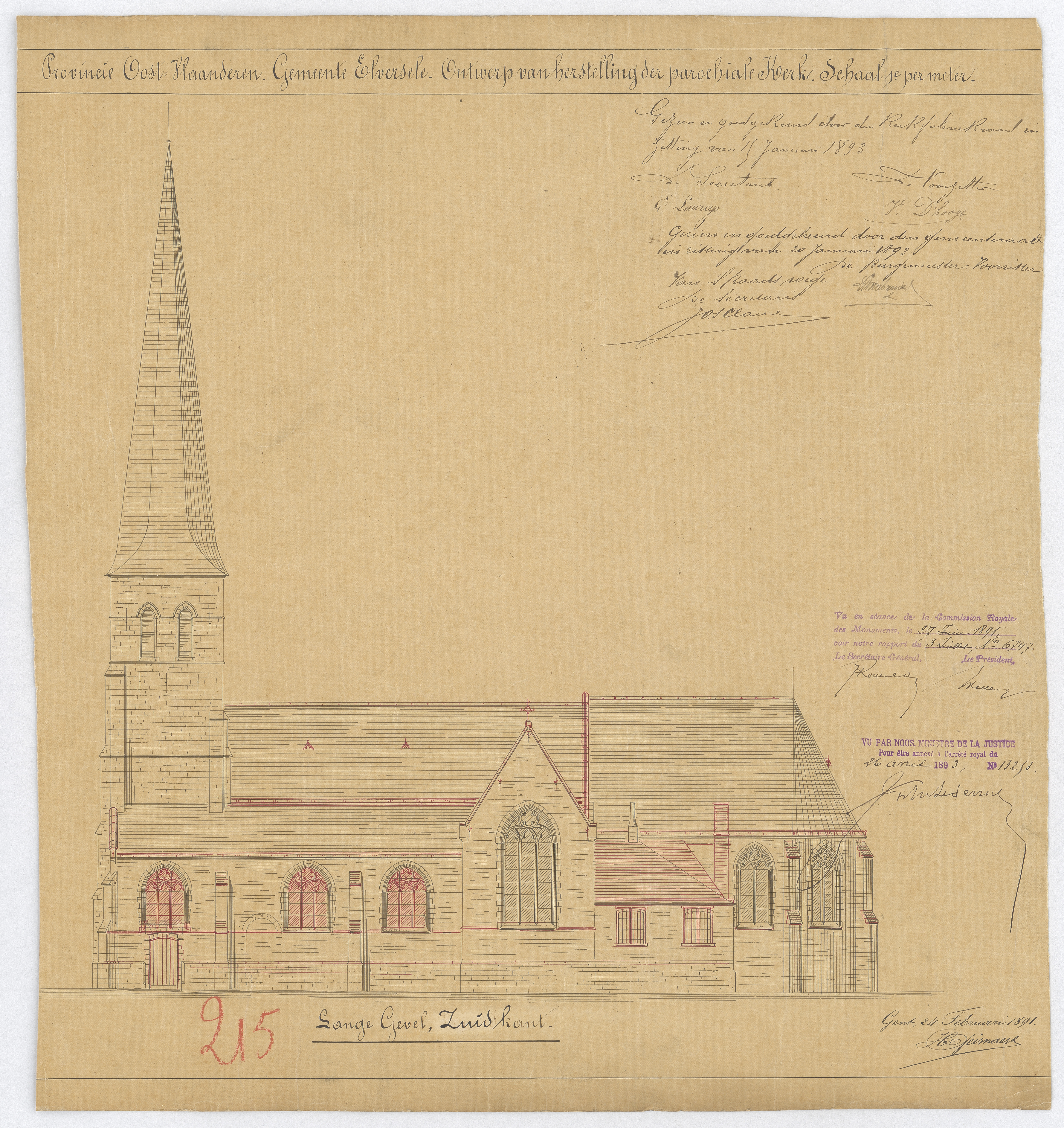 Opschrift: Provincie Oost-Vlaanderen. Gemeente Elversele. Ontwerp tot herstelling der parochiale Kerk. Omschrijving plan: opstand Z-gevel Datum KCML: 27/06/1891 Archiefnummer: O1227