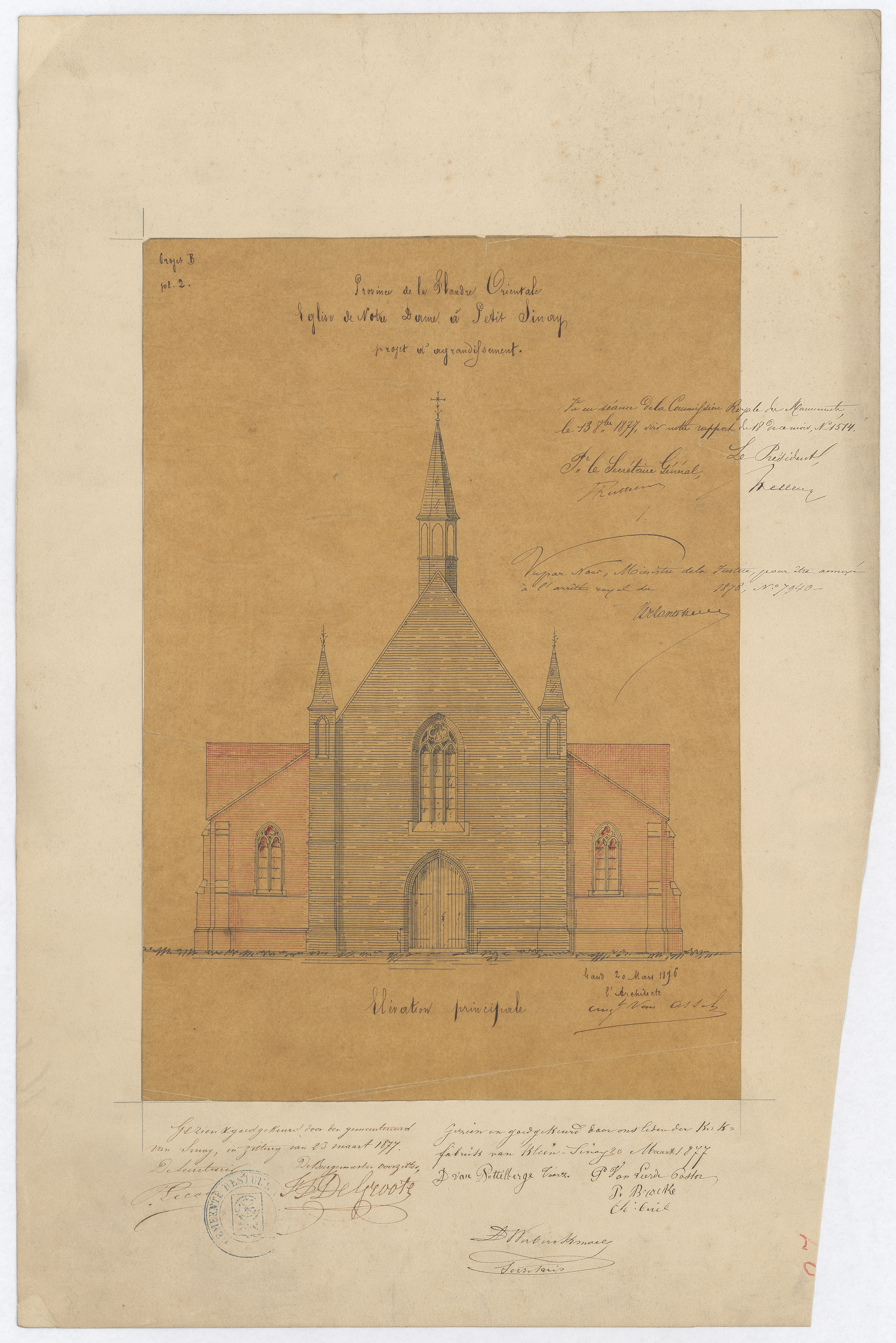 Opschrift: Province de la Flandre Orientale. Eglise de Notre Dame à Petit Sinay. Projet d'agrandissement Omschrijving plan: opstand voorgevel Datum KCML: 13/10/1877 Archiefnummer: O1210