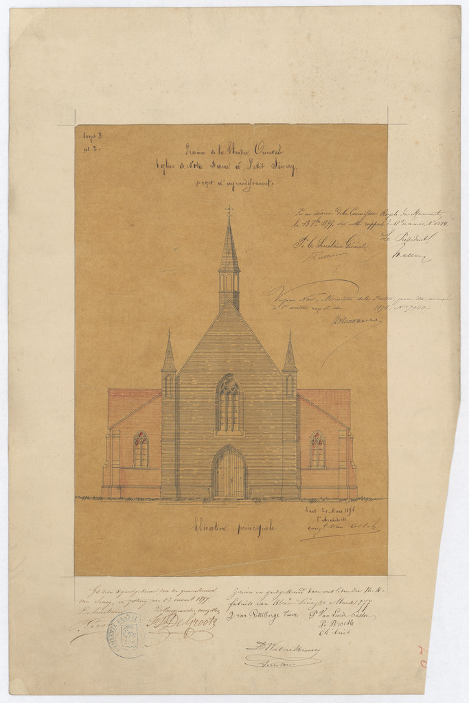 Opschrift: Province de la Flandre Orientale. Eglise de Notre Dame à Petit Sinay. Projet d'agrandissement Omschrijving plan: opstand voorgevel Datum KCML: 13/10/1877 Archiefnummer: O1210
