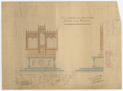 Opschrift: Provincie Oost-Vlaanderen. Gemeente Stekene. Zijde Autaar van den H. Antonius Omschrijving plan: voor- en zijaanzicht zijaltaar H. Antonius Datum KCML: 08/01/1898 Archiefnummer: O1202