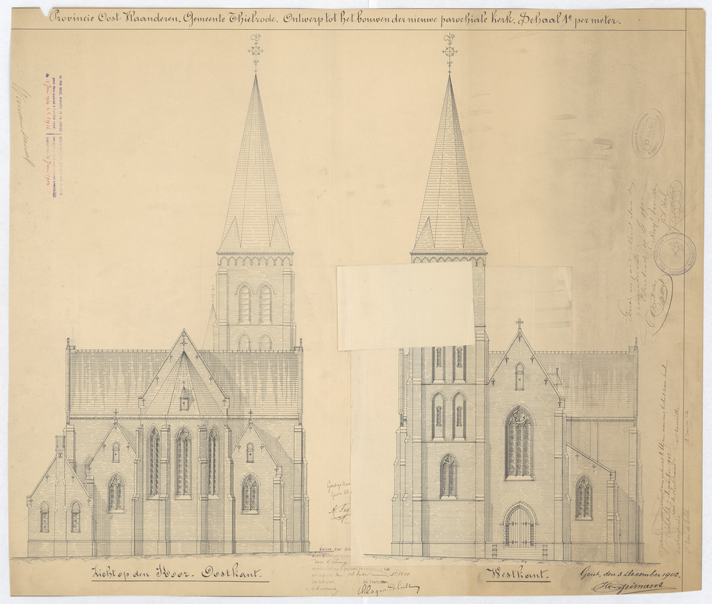 Opschrift: Provincie Oost-Vlaanderen. Gemeente Thielrode. Ontwerp tot het bouwen der nieuwe parochiale kerk. Omschrijving plan: opstanden voor- en achtergevel Datum KCML: 6-6-1903 Archiefnummer: O1247_02