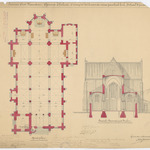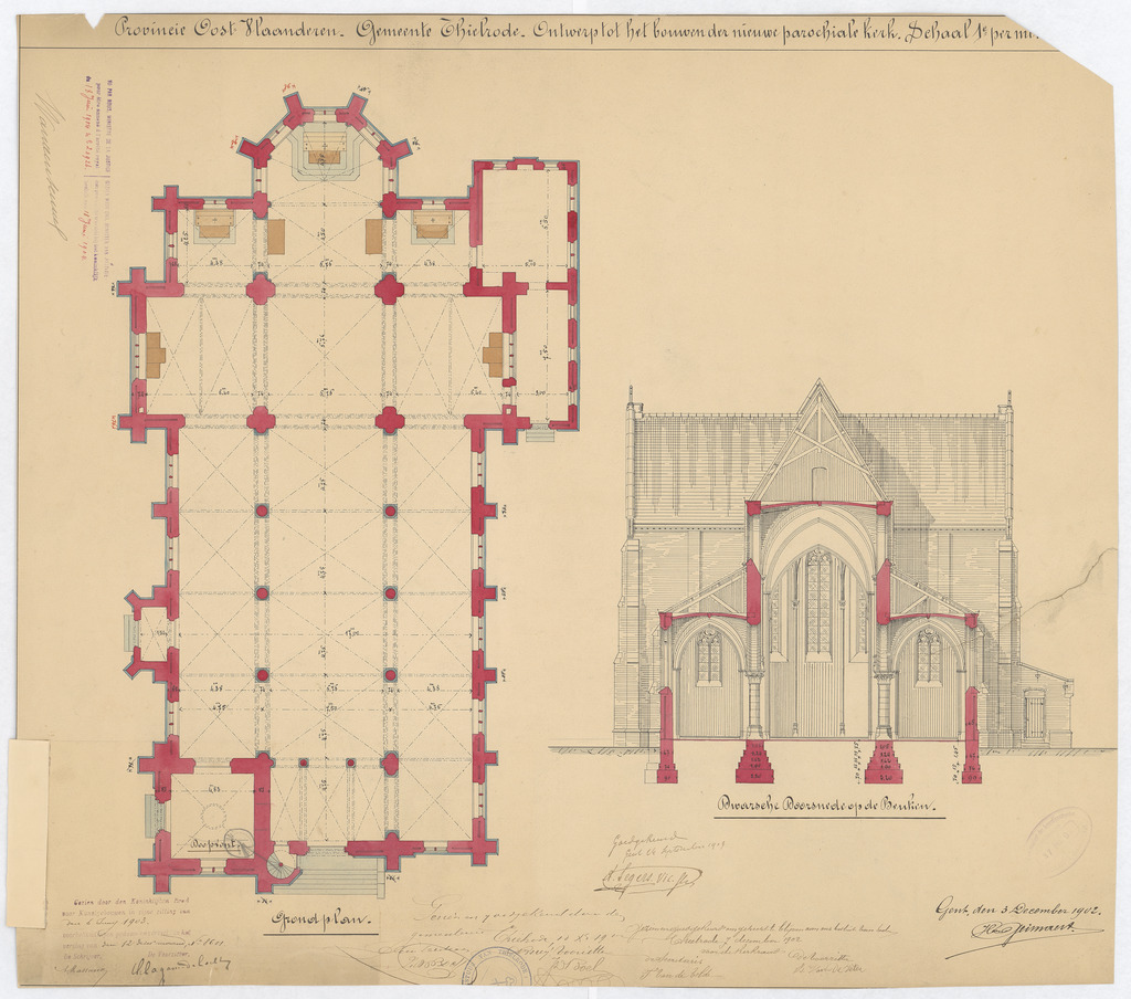 Opschrift: Provincie Oost-Vlaanderen. Gemeente Thielrode. Ontwerp tot het bouwen der nieuwe parochiale kerk. Omschrijving plan: plattegrond en dwarsdoorsnede Datum KCML: 6-6-1903 Archiefnummer: O1246_02
