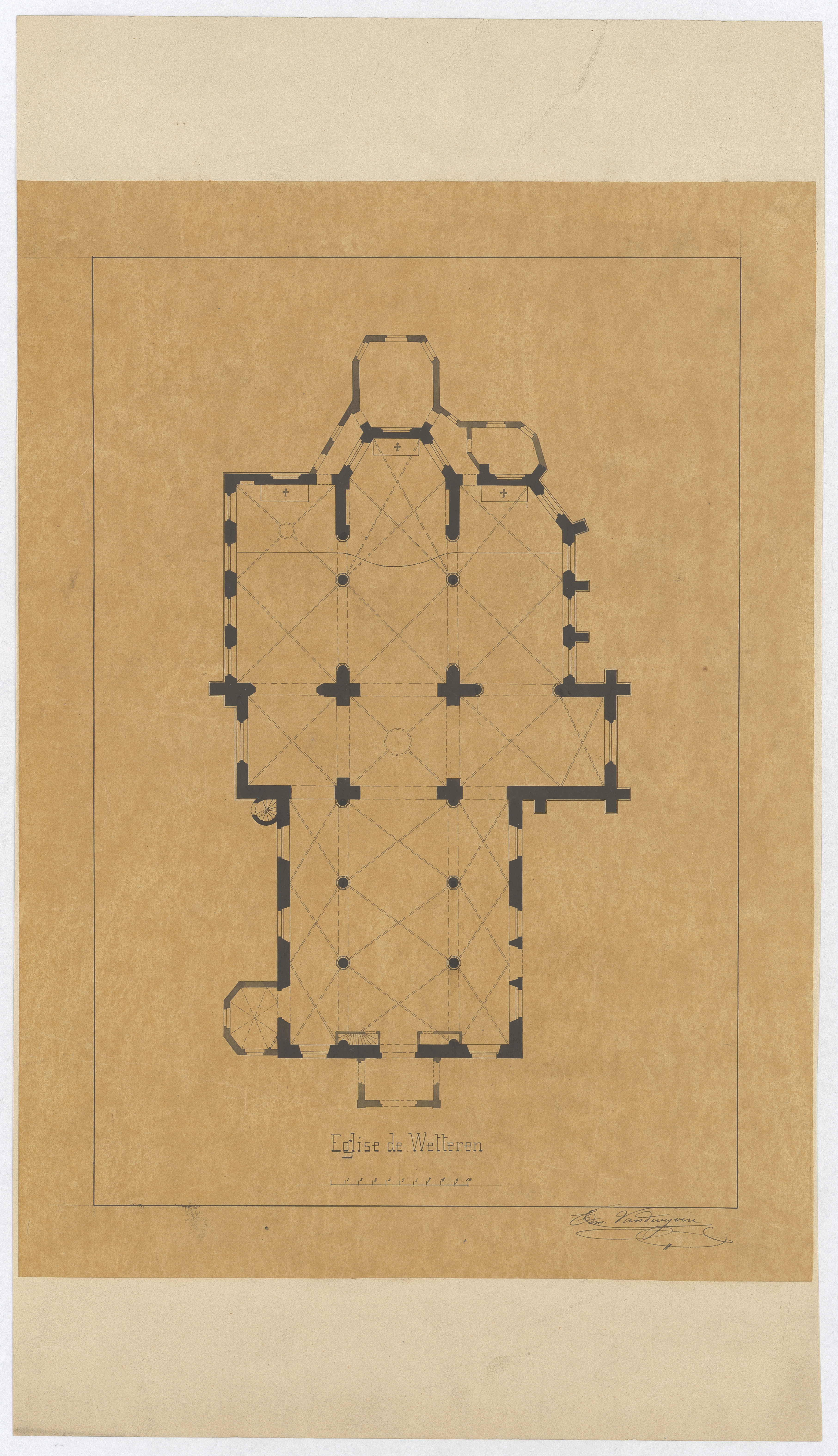 Opschrift: Eglise de Wetteren Omschrijving plan: plattegrond niveau 0 Datum KCML: deze informatie wordt niet vermeld op het archiefstuk Archiefnummer: O1310