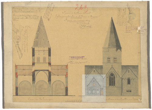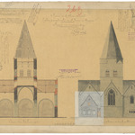 Opschrift: Province de la Flandre Orientale. Eglise paroissiale de St. Pierre à Huysse. Projet de restauration. Omschrijving plan: opstand achtergevel en dwarsdoorsnede (aangepast ontwerp) Datum KCML: 04/07/1892 Archiefnummer: O1392_01