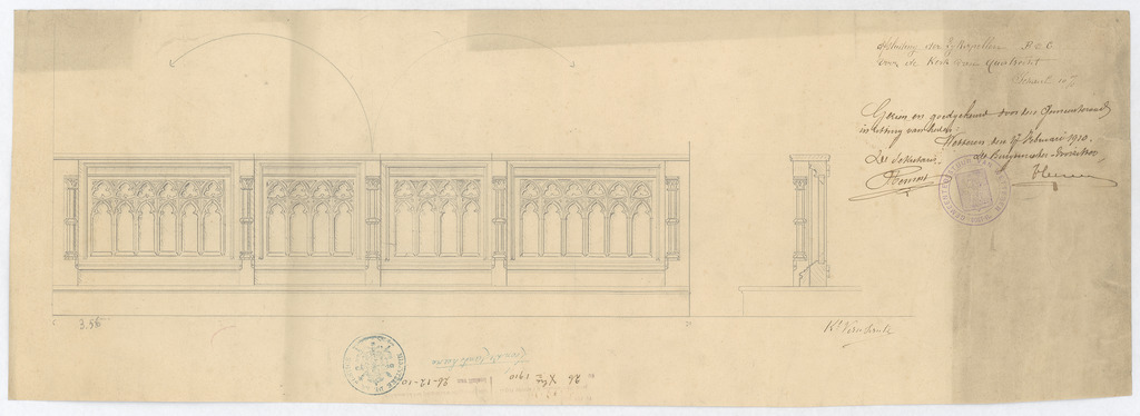 Opschrift: Afsluiting der zijkapellen B & C voor de kerk van Quatrecht. Omschrijving plan: voor- en zijaanzicht afsluiting zijkapellen Datum KCML: deze informatie wordt niet vermeld op het archiefstuk Archiefnummer: O1320