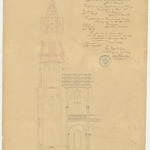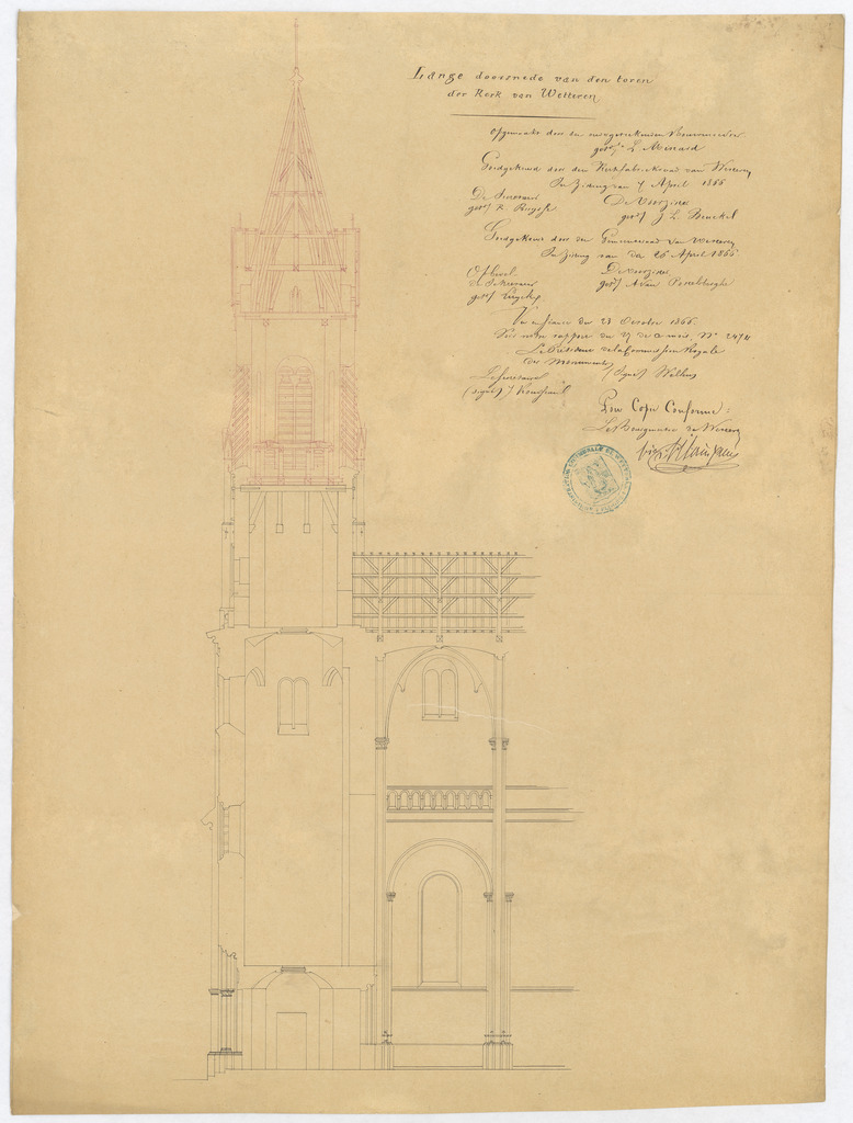 Opschrift: Lange doorsnede vand en toren der Kerk van Wetteren Omschrijving plan: langsdoorsnede Datum KCML: 23/10/1866 Archiefnummer: O1305