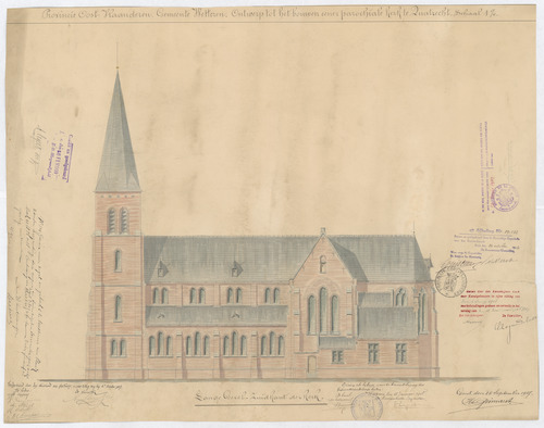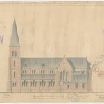 Opschrift: Provincie Oost-Vlaanderen. Gemeente Wetteren. Ontwerp tot het bouwen eener parochiale kerk te Quatrecht. Omschrijving plan: opstand Z-gevel Datum KCML: 6-6-1908 Archiefnummer: O1317