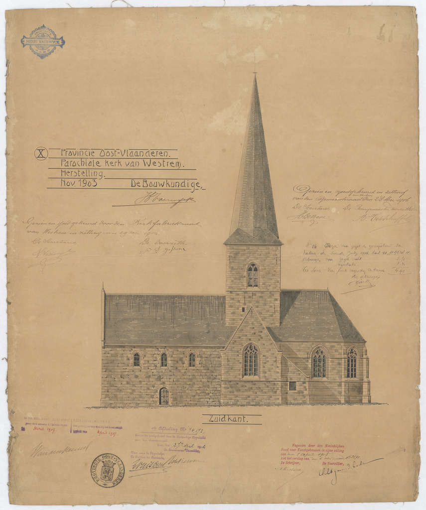 Opschrift: Provincie Oost-Vlaanderen. Parochiale kerk van Westrem. Herstelling. Omschrijving plan: opstand Z-gevel Datum KCML: 1 /04/1905 Archiefnummer: O1338