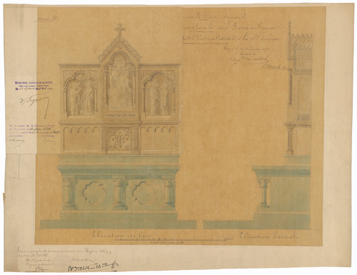 Opschrift: Province de la Flandre Orientale. Eglise paroissiale de St. Pierre à Huysse. Projet d'Autel latéral dédié à la Ste. Vierge. Omschrijving plan: voor- en zijaanzicht zijaltaar H.Maagd (aangepast ontwerp) Datum KCML: 11/05/1895 Archiefnummer: O1396_01