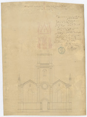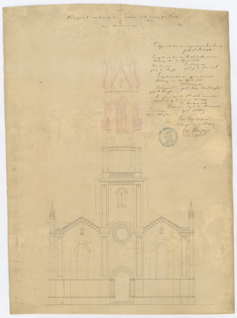 Opschrift: voorgevel van het op te maken deel toren der Kerk van Wetteren. Omschrijving plan: opstand voorgevel Datum KCML: 23/10/1866 Archiefnummer: O1304