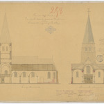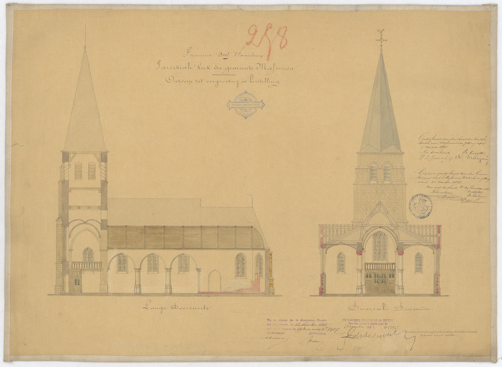 Opschrift: Provincie Oost-Vlaanderen. Parochiale kerk der gemeente Massemen. Ontwerp tot vergrooting en herstelling. Omschrijving plan: langs- en dwarsdoorsnede Datum KCML: 12/11/1892 Archiefnummer: O1326