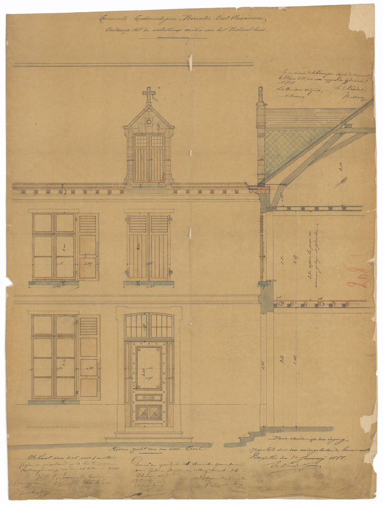 Opschrift: Gemeente Godveerdegem. Provintie Oost-Vlaanderen. Ontwerp tot de erstellingswerken van het Pastoreel huis. Omschrijving plan: opstand voorgevel en doorsnede Datum KCML: 22/06/1888 Archiefnummer: O1449