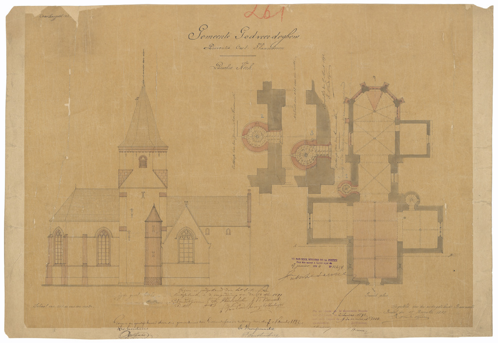 Opschrift: Gemeenten Godveerdeghem. Provintie Oost-Vlaanderen. Parochiek Kerk. Omschrijving plan: plattegrond en opstand zijgevel Datum KCML: 2 /07/1892 Archiefnummer: O1431
