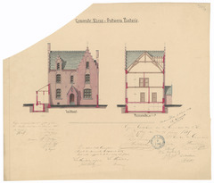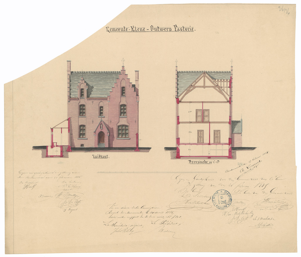 Opschrift: Gemeente Elene. Ontwerp Pastorie Omschrijving plan: opstand voorgevel en doorsnede Datum KCML: 24/04/1885 Archiefnummer: O1423