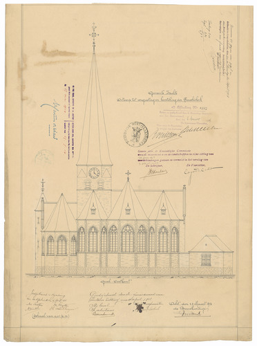 Opschrift: Gemeente Zulte. Ontwerp tot vergrooting en herstelling der parochiekerk. Omschrijving plan: opstand O-gevel Datum KCML: 28/06/1913 Archiefnummer: O1480