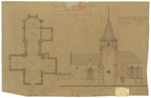 Opschrift: Kerk van Godveerdegem. Provincie Oost-Vlaanderen. Ontwerp tot de erstelling Werken van den toren. Omschrijving plan: plattegrond en opstand zijgevel Datum KCML: 28/06/1890 Archiefnummer: O1428_02