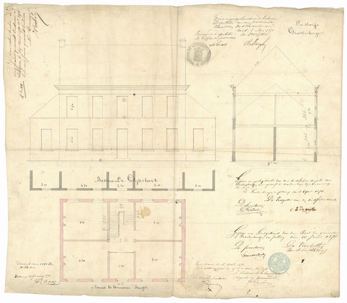 Opschrift: Pastorij Grootenberge Omschrijving plan: plattegrond, opstand voorgevel en doorsnede bestaande toestand Datum KCML: 12/04/1871 Archiefnummer: O1451