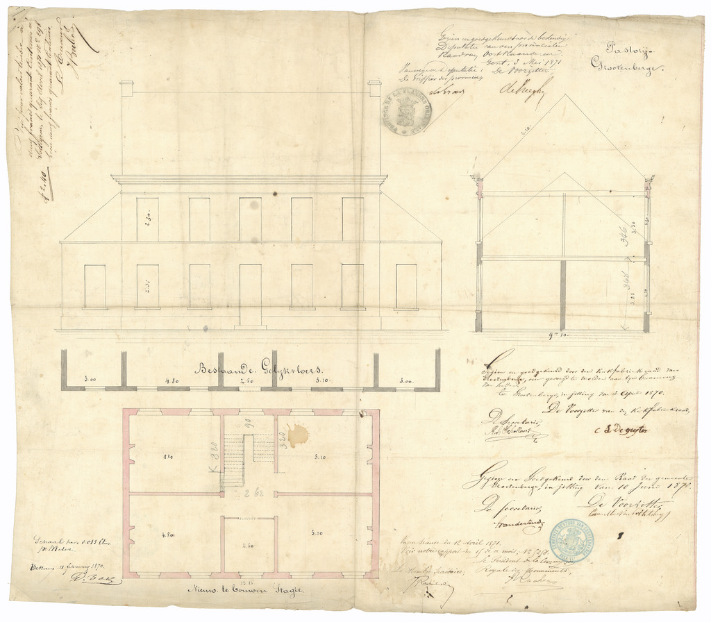 Opschrift: Pastorij Grootenberge Omschrijving plan: plattegrond, opstand voorgevel en doorsnede bestaande toestand Datum KCML: 12/04/1871 Archiefnummer: O1451