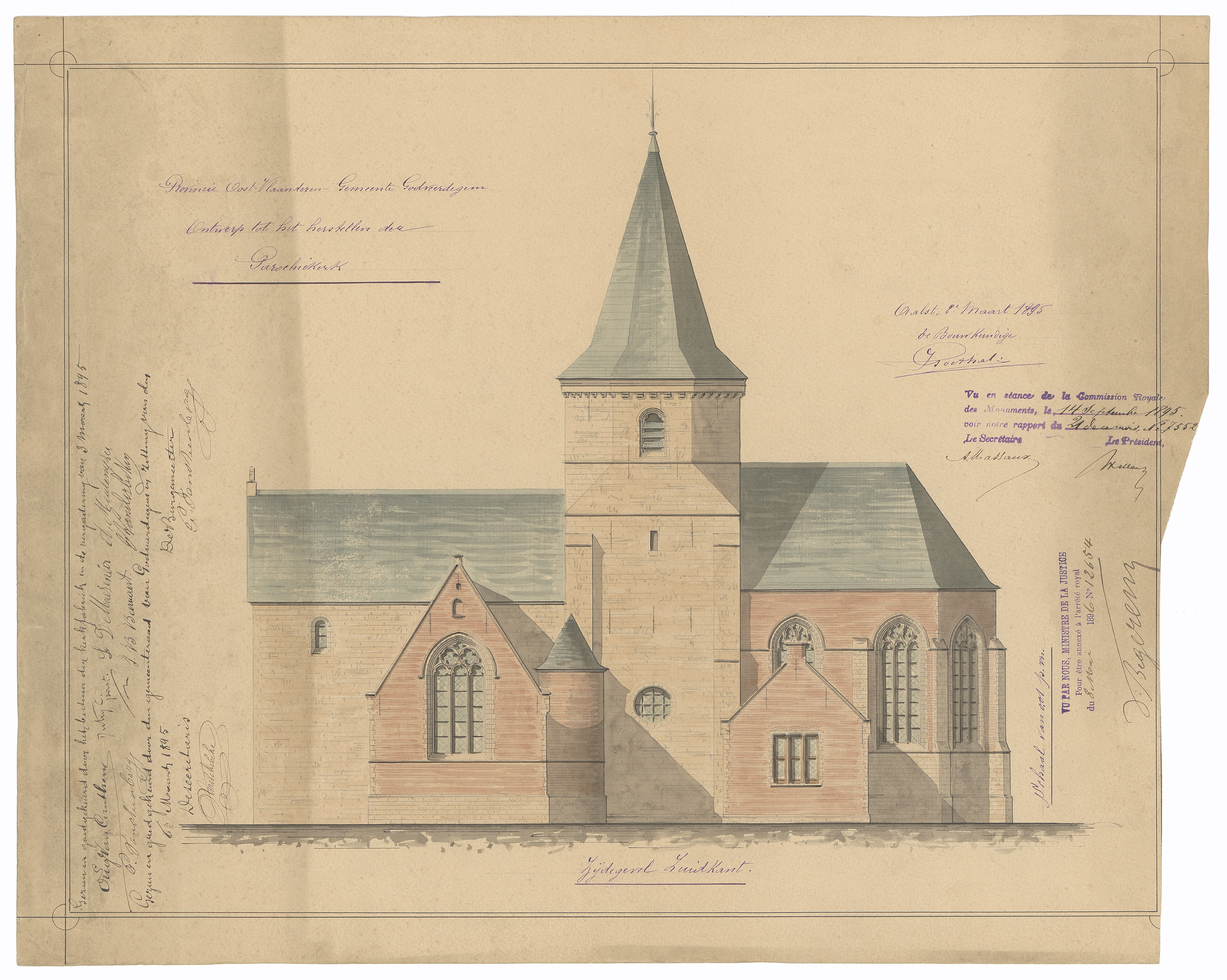 Opschrift: Provincie Oost-Vlaanderen. Gemeente Godveerdegem. Ontwerp tot herstelling der Parochiekerk. Omschrijving plan: opstand Z-gevel Datum KCML: 14/09/1895 Archiefnummer: O1435