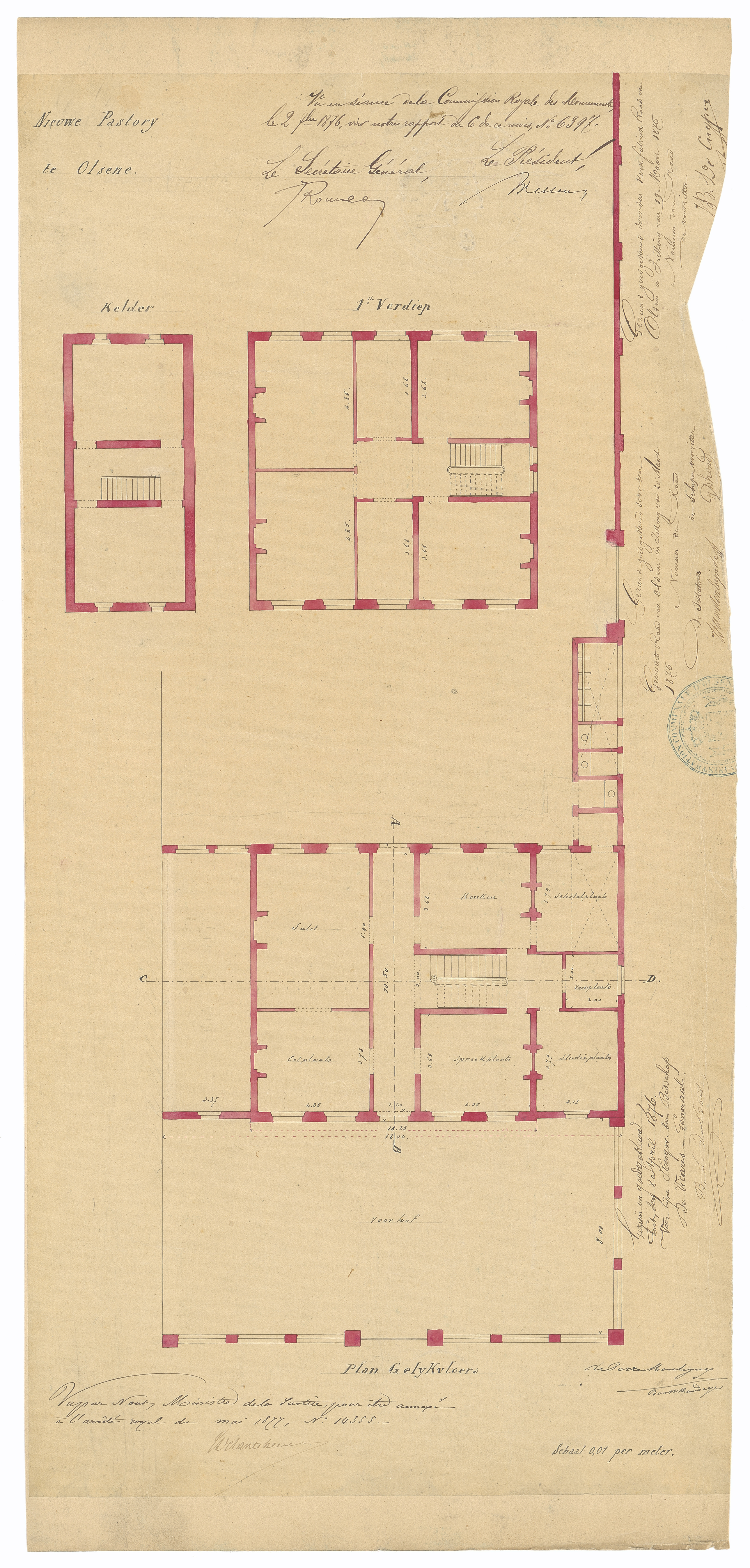 Opschrift: Nieuwe Pastory te Olsene Omschrijving plan: plattegrond niveau 0 Datum KCML: 2 /09/1876 Archiefnummer: O1499
