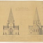 Opschrift: Province de la Flandre Orientale. Eglise paroissiale de Audenhove Ste Marie. Projet de restauration du choeur avec nouvelle sacristie. Omschrijving plan: opstand achtergevel en dwarsdoorsnede Datum KCML: 28/08/1875 Archiefnummer: O1459