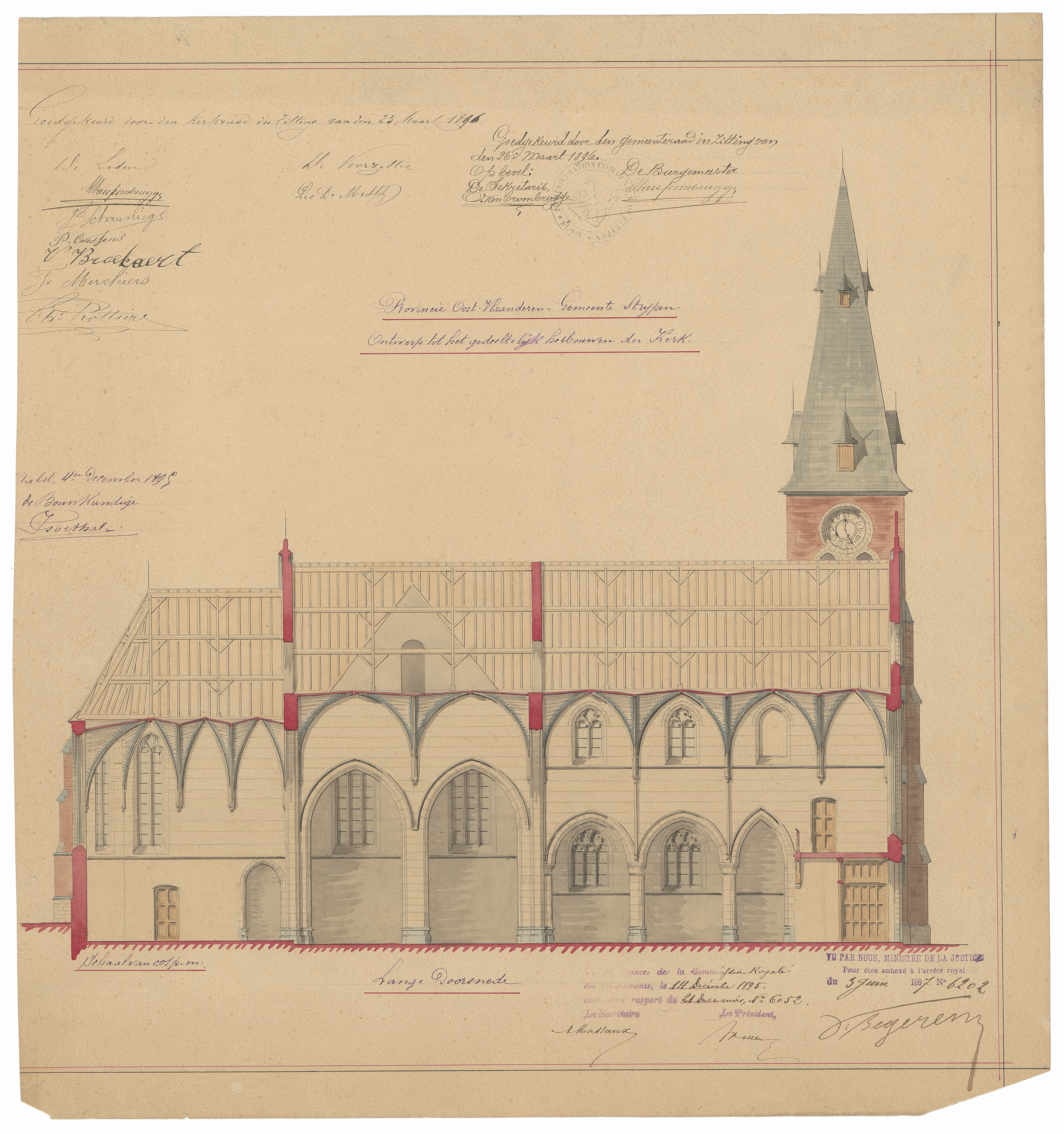 Opschrift: Provincie Oost-Vlaanderen. Gemeente Strijpen. Ontwerp tot het gedeeltelijk herbouwen der kerk. Omschrijving plan: langsdoorsnede Datum KCML: 14/12/1895 Archiefnummer: O1473