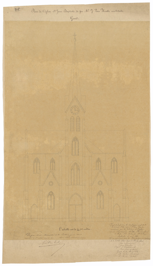 Opschrift: Plan de l'église St. Jean Baptiste. Omschrijving plan: opstand voorgevel Datum KCML: deze informatie wordt niet vermeld op het archiefstuk Archiefnummer: O1565