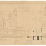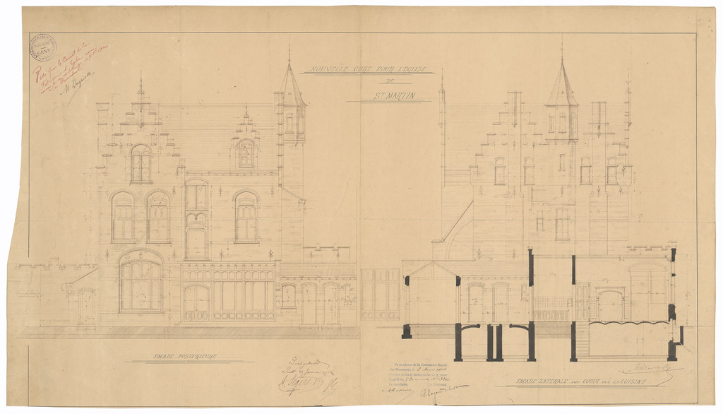 Opschrift: Nouvelle cure pour l'Eglise de St. Martin. Omschrijving plan: opstanden achter- en zijgevel (met gedeeltelijke doorsnede) Datum KCML: 2 /03/1901 Archiefnummer: O1595