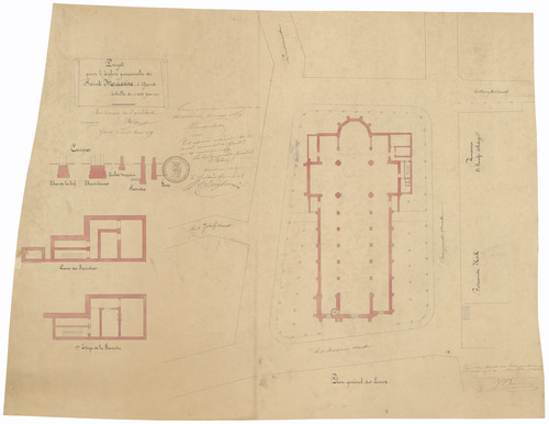 Opschrift: Projet pour l'Eglise paroissiale de Saint Macaire, à Gand. Omschrijving plan: plattegrond niveau 0 Datum KCML: deze informatie wordt niet vermeld op het archiefstuk Archiefnummer: O1578