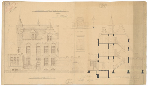 Opschrift: Nouvelle cure pour l'Eglise de St. Martin. Omschrijving plan: opstand voorgevel en doorsnede Datum KCML: 2 /03/1901 Archiefnummer: O1594