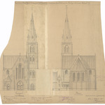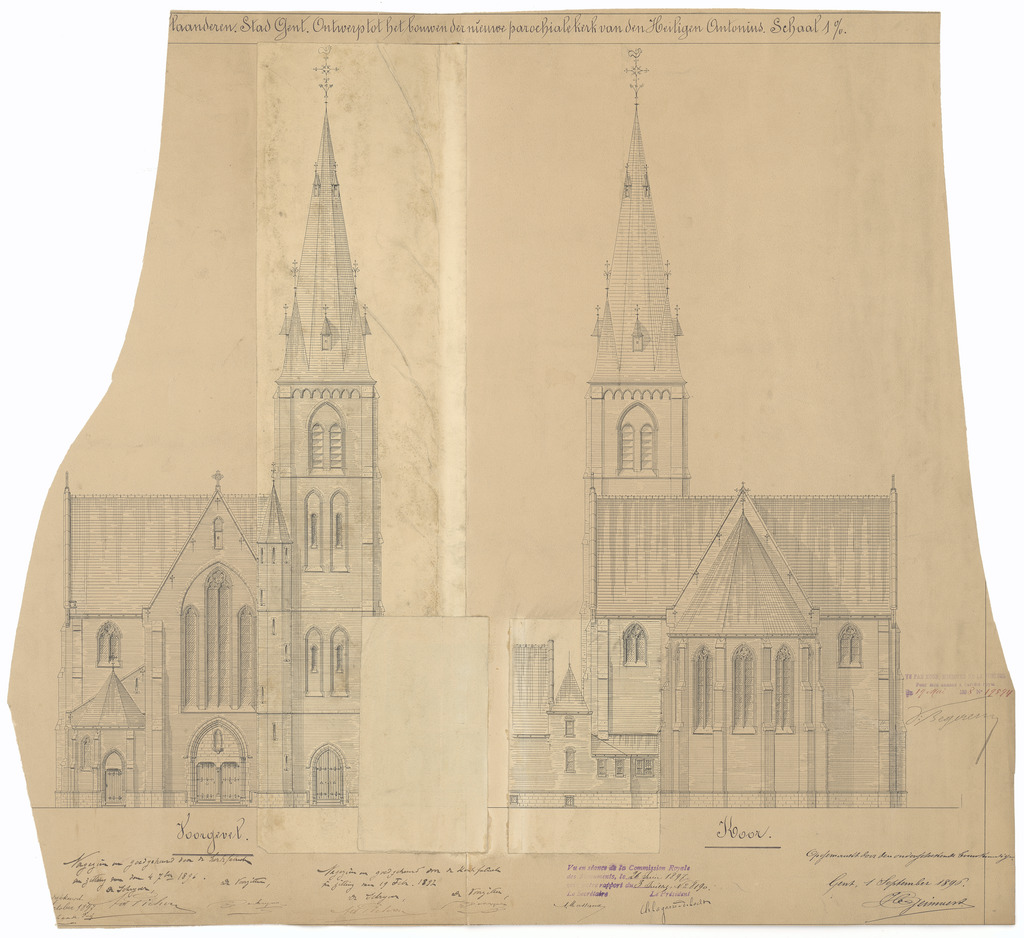 Opschrift: Provincie Oost-Vlaanderen. Stad Gent. Ontwerp tot het bouwen der nieuwe parochiale kerk van den Heiligen Antonius. Omschrijving plan: opstanden voor- en achtergevel Datum KCML: 26/06/1897 Archiefnummer: O1514_02