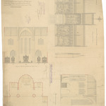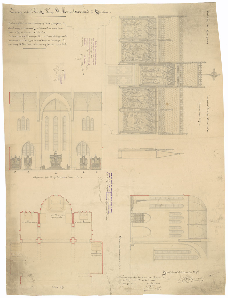 Opschrift: Parociale Kerk Van St. Macharius te Gent. Ontwerp tot het aanbrengen van groepen in den hoogen autaaer en plaatsen van twee nieuwe Zijde autaars te weten: in den noorder transept ter eere van St. Macharius patroon der kerk en in den zuider transept ter eere van St. Hubertus tweeden patroon der kerk. Omschrijving plan: plattegrond, zicht op koor, doorsnede koor, voor- en zijaanzicht altaar Datum KCML: 17/02/1900 Archiefnummer: O1583